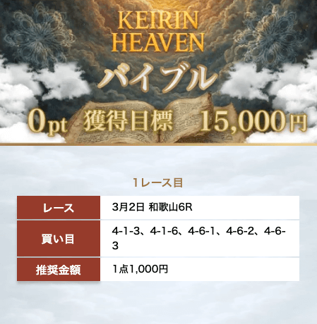 | 昼夜ミカエル | 300万円 | 3000pt(300,000円) | 1点2,000円 | 2レース(コロガシ)3連単5点 |