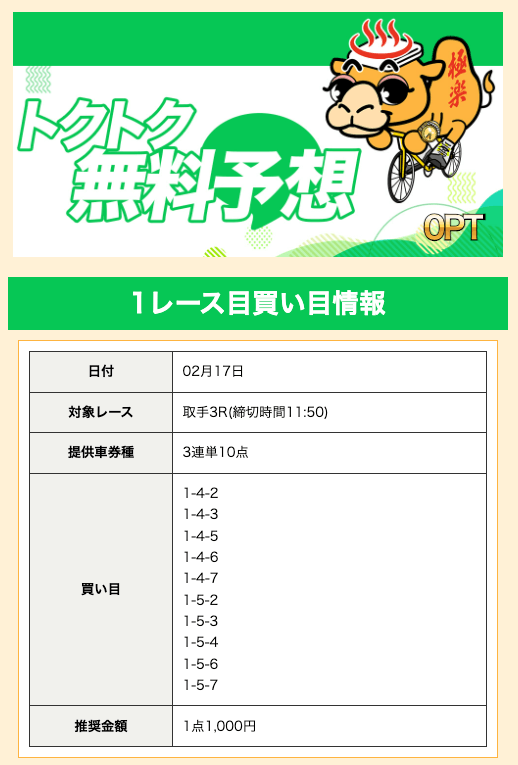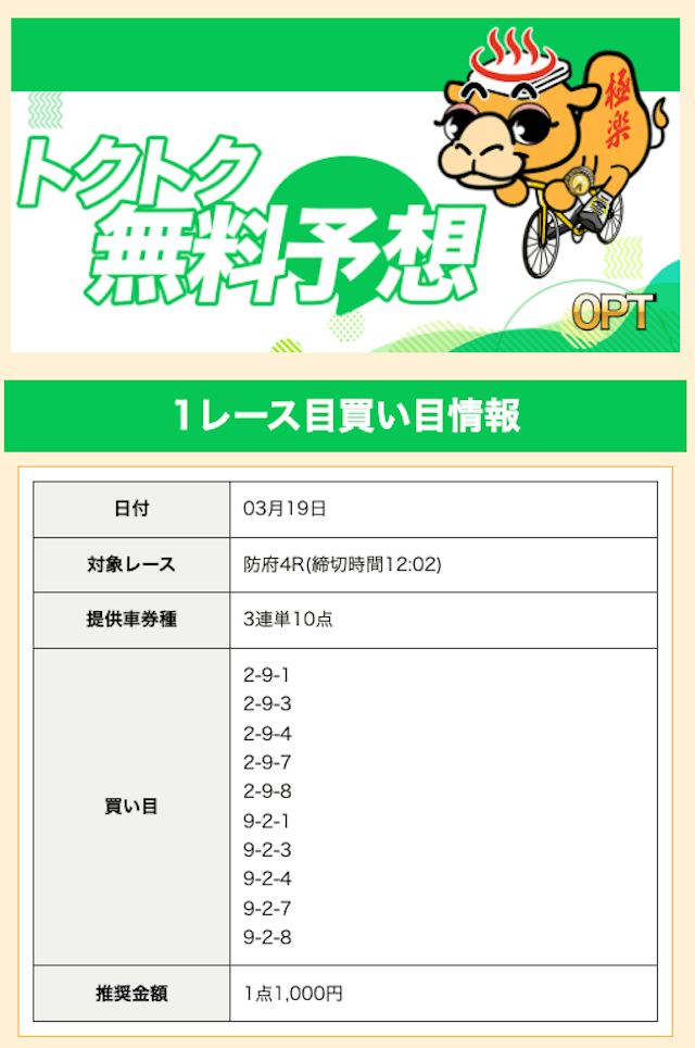 なお、無料予想は毎日1レース提供で、予め参加することで買い目を閲覧することができます。